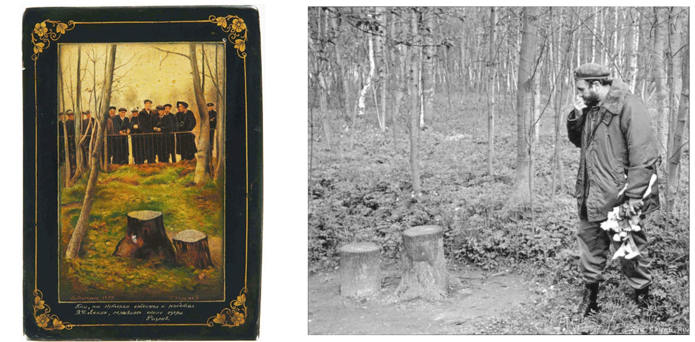 What do we see here? On the left is a papier-mâché box, with a Palekh style miniature on it. It is dated 1961. The style developed after icon painters from the city of Palekh had to find new jobs following the revolution of 1917. The painting on the box depicts the tree stumps on which Vladimir Ilich Lenin used to rest and work. In the distance a foreign delegation looks on.